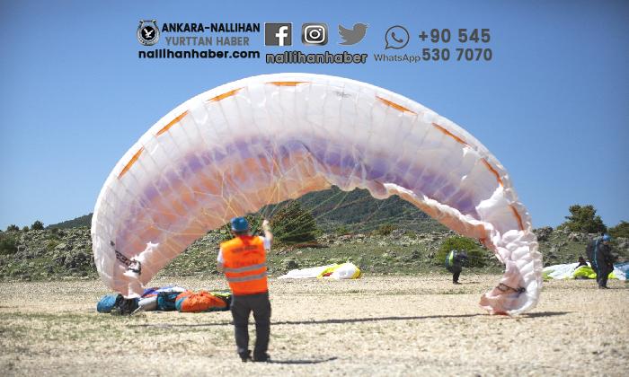 Beypazarı Üreğil Mahallesi’nde bulunan bin 450 metre yükseklikteki Ovacık Yaylasında toplanan yamaç paraşütçüleri, İsrail zulmü altındaki Filistinlilere takviye olmak için paraşütlerine astıkları Filistin bayrakları ile uçuş yaptı.